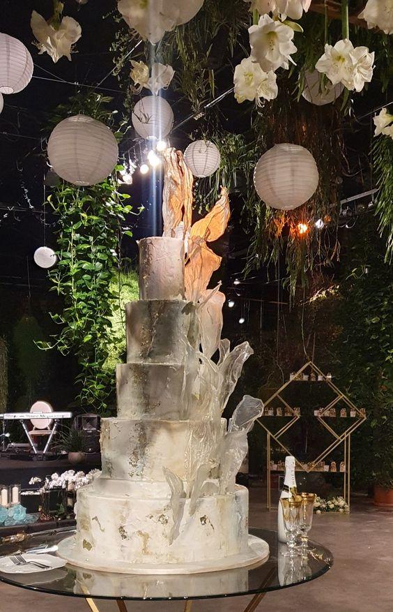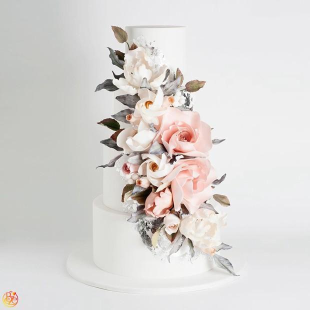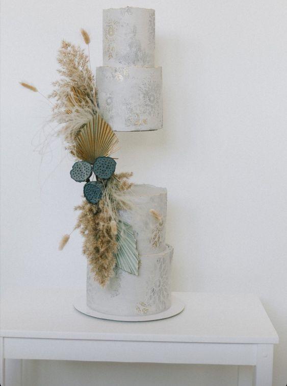 Торт белый с серебряным покрытием и букетом сухоцветов